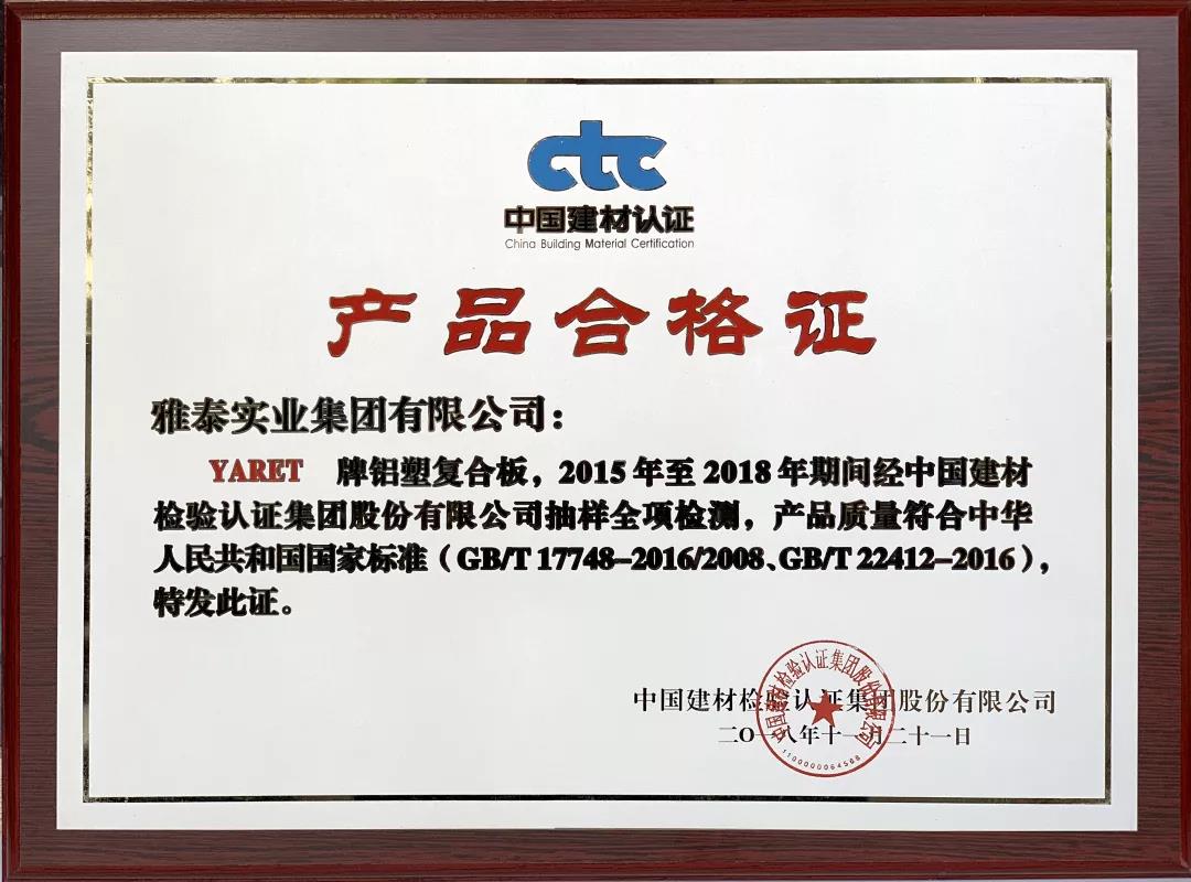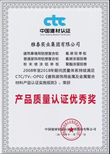 會(huì)上,雅泰產(chǎn)品憑借2008年至今2018年期間質(zhì)量體系持續(xù)滿足CTC/TVL-OP02《建筑裝飾用金屬及金屬?gòu)?fù)合材料產(chǎn)品認(rèn)證實(shí)施規(guī)則》,榮獲2018年度CTC產(chǎn)品質(zhì)量認(rèn)證優(yōu)秀獎(jiǎng)。YARET牌鋁塑復(fù)合板,2015年至2018年期間經(jīng)中國(guó)建材檢驗(yàn)認(rèn)證集團(tuán)股份有限公司抽樣全項(xiàng)檢測(cè),產(chǎn)品質(zhì)量符合中華人民共和國(guó)國(guó)家標(biāo)準(zhǔn)(GB/T 17748-2016/2008、GB/T22412-2016),被授予2018年度產(chǎn)品合格證。