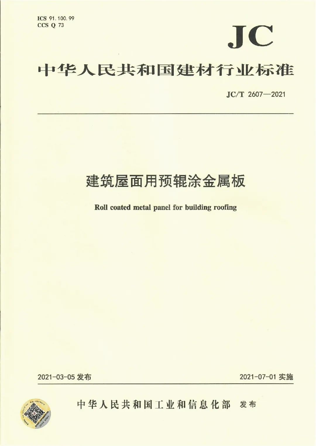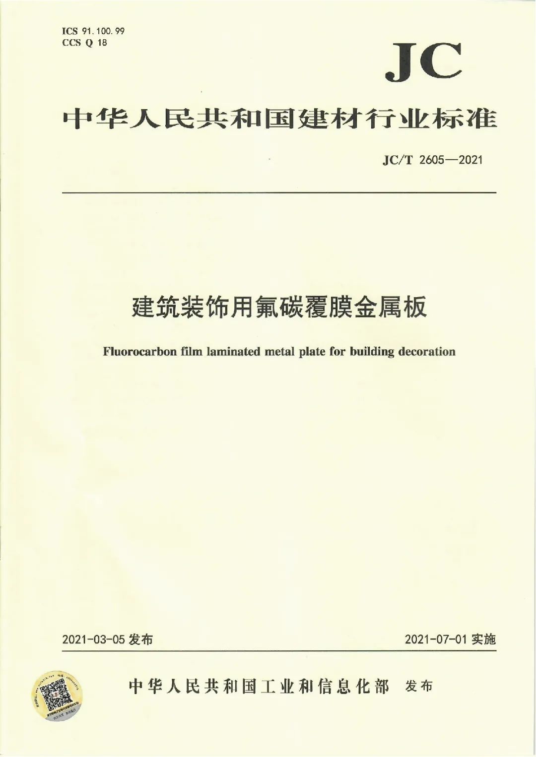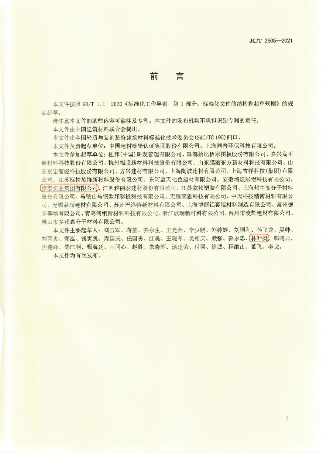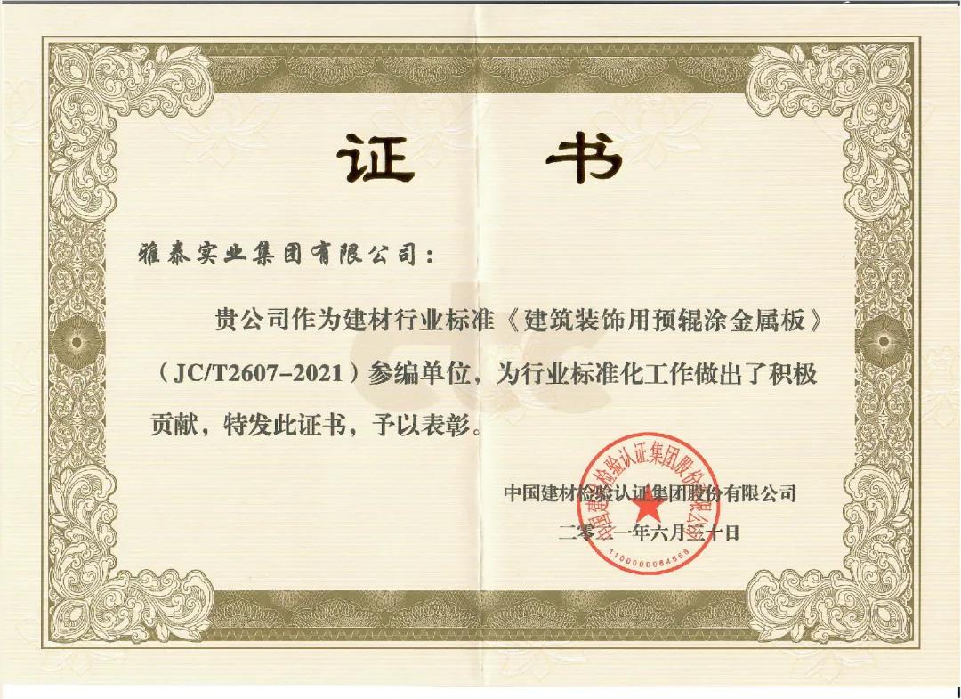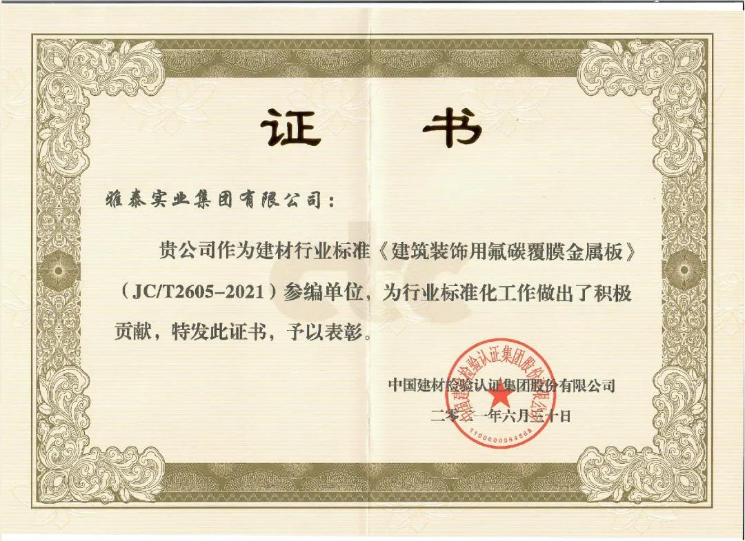 近日,由中國建筑材料聯(lián)合會提出,雅泰實業(yè)集團參與起草的《JC/T2605-2021建筑裝飾用氟碳覆膜金屬板》、《JC/T2607-2021建筑屋面用預(yù)輥涂金屬板》兩項行業(yè)標(biāo)準(zhǔn)于2021年3月5日發(fā)布,同年7月1日正式實施,公司技術(shù)部經(jīng)理林葉挺為此次兩項行業(yè)標(biāo)準(zhǔn)的主要起草人之一。