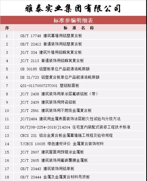 截至目前,雅泰作為參編單位參與國家標(biāo)準(zhǔn)、行業(yè)標(biāo)準(zhǔn)等各項標(biāo)準(zhǔn)共計 18 項(詳見參編標(biāo)準(zhǔn)一覽表),逐漸成為行業(yè)推進標(biāo)準(zhǔn)化工作的主力軍之一,不斷證明公司地位及整體生產(chǎn)水品、產(chǎn)品實力等已得到業(yè)內(nèi)認(rèn)可。
